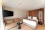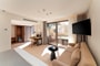 The interior of the suite is adorned in warm, earthy tones, with carefully curated design details that exude understated luxury.